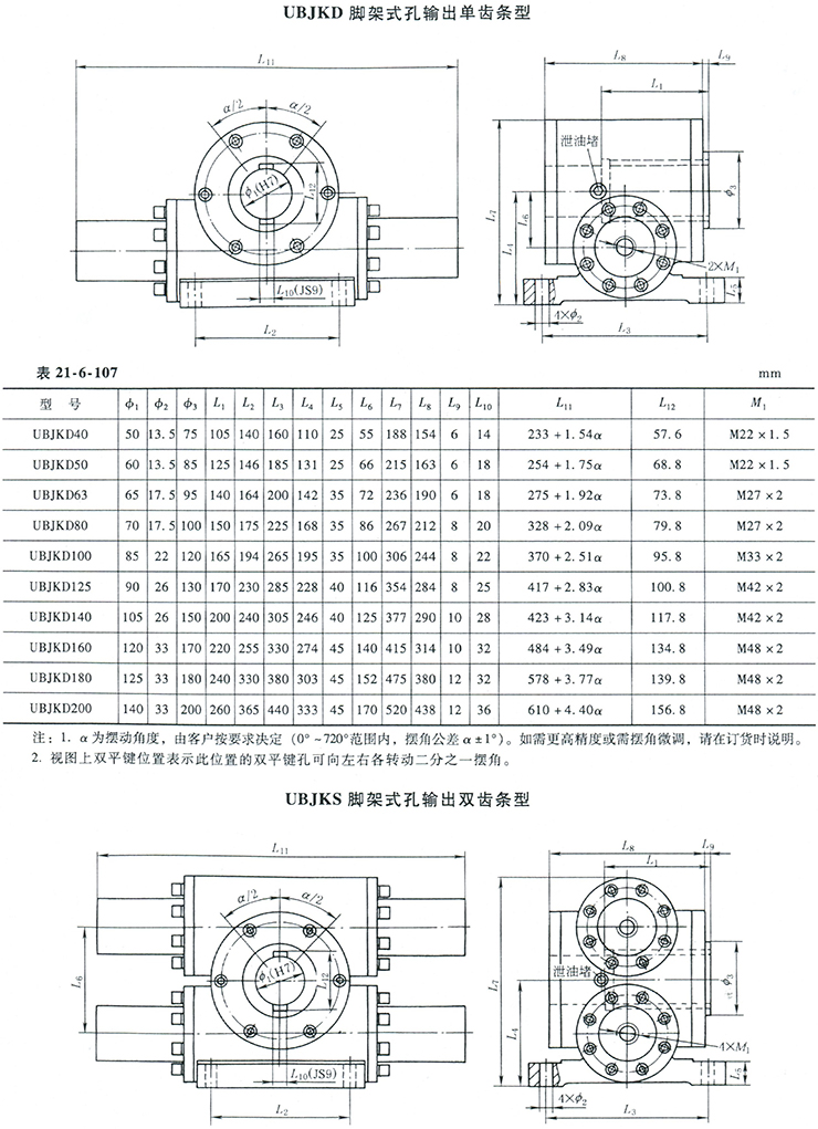 UB型齒輪齒條擺動油缸公稱壓力為16MPa,有單齒條和雙齒條兩種結構型式;有法蘭式和腳架式兩種安裝方式;有軸和孔兩種輸出方式。